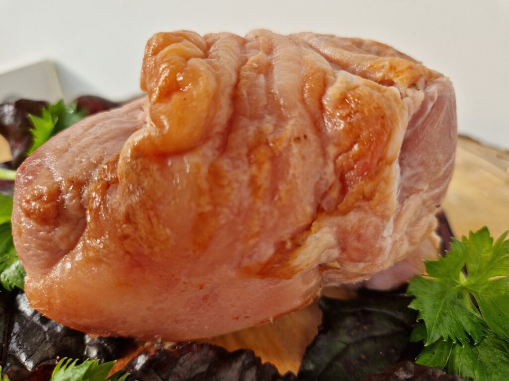 Golonka ze skórą bez kości w to wyśmienite i kruche mięso. Posiada warstwę skóry i tłuszczu. Pieczona w piecu konwekcyjnym. Rewelacyjnie smakuje podana zarówno na ciepło jak i na zimno.