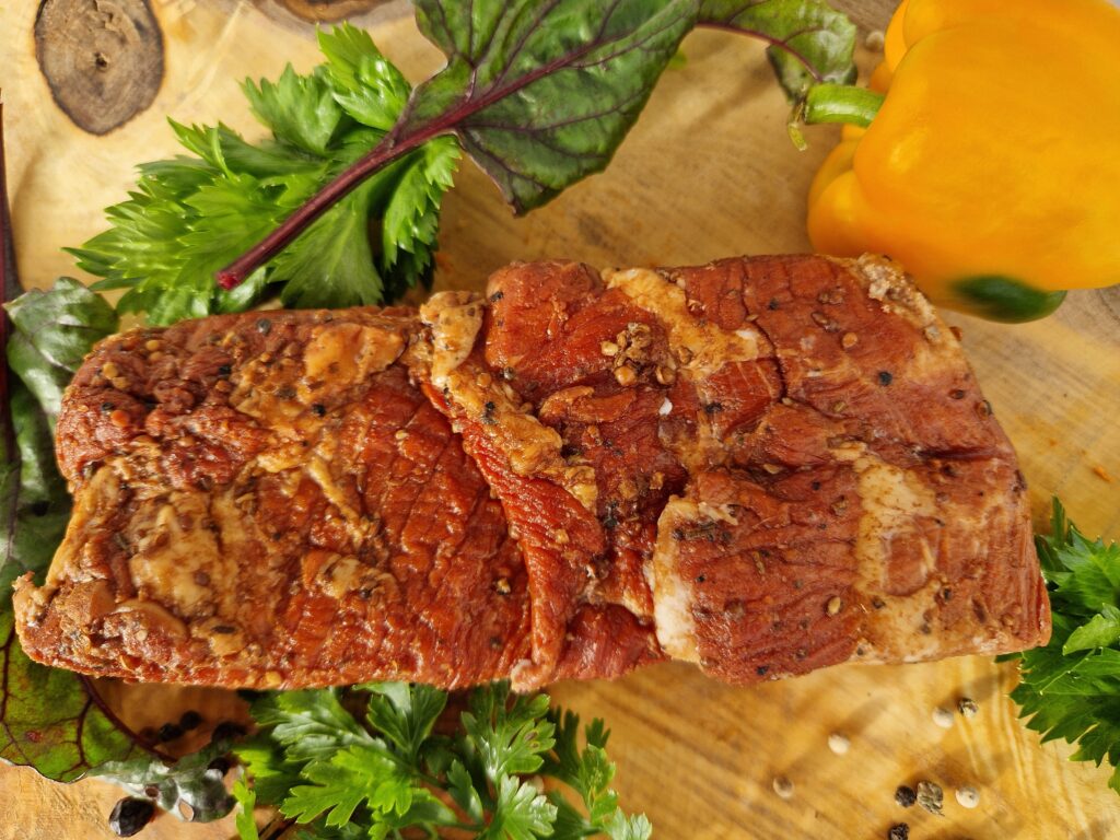 To boczek wieprzowy najwyższej jakości, który jest przyprawiany, a następnie pieczony w odpowiednio dobranej temperaturze, aby zachować soczystość mięsa.